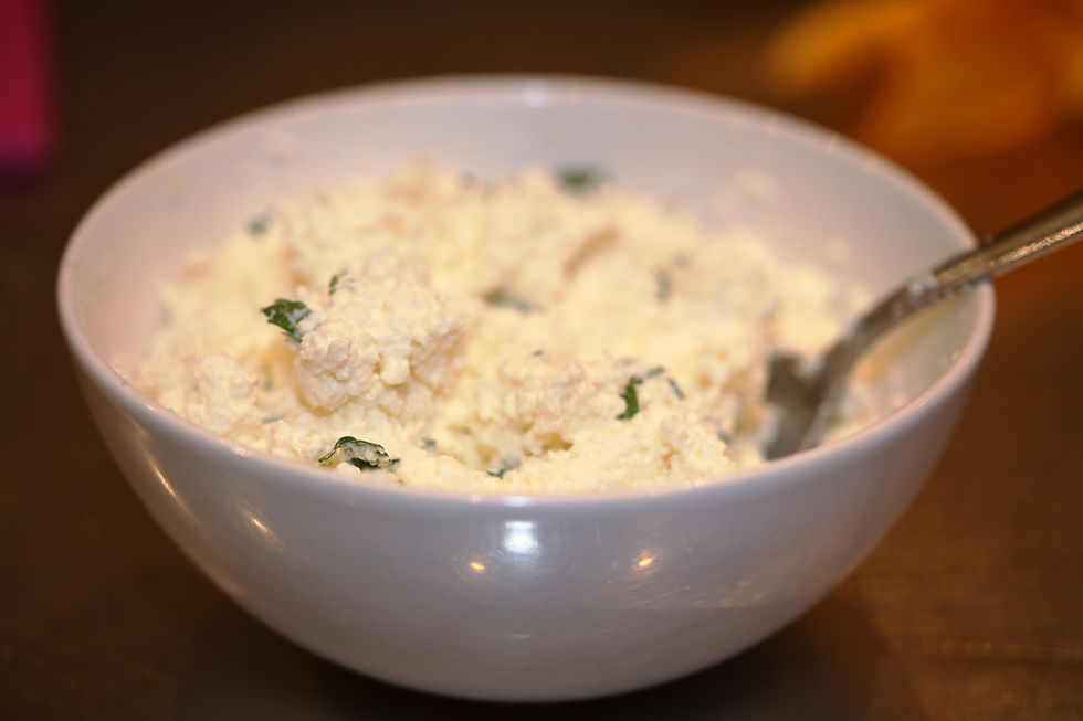 2. Творог (сыр) перемешать с измельченными чесноком и зеленью. Посолить по вкусу.